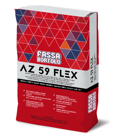 • Product for professional use. • Always consult the safety data sheet before use. • Fresh adhesive should be protected from direct sun, rain and frost for at least 24 hours. • Do not use directly on coatings or membranes made from bitumen or tar. • Verify compatibility of the adhesive with slabs made from stone material or natural stones, applying reinforcing systems on the rear. • Comply with national standards in force. AZ 59 FLEX it must be used in its original state without the addition of foreign materials.
